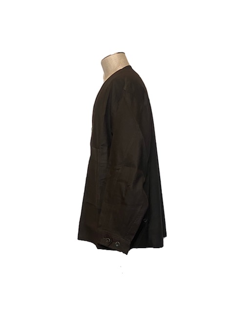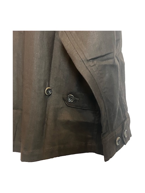 rdv o globeからNOAH VE.をリリース。素材には、(ブラウン)泥ベンガラ墨コーティングを施したリネン・コットンのヘリンボーン素材を使用しております。地染め後、ベンガラと墨でコーティングを原反ワッシャーを行い手作業で染めたようなランダムなシワ感、自然なムラ感が現れます経年変化したような雰囲気と和テイストが特徴です。ノーカラーのデザインでカーディガンのようにインナーとしても活躍できるデザインです。フロントには4つのポケットがデザインされておりハンティングジャケットに用いられるクラシカルなフラップ付きの腰ポケットもあり機能性も完備しております。サイドにはアジャスターが施されており立体的なシルエットもお楽しみいただけますのでぜひお試しください。