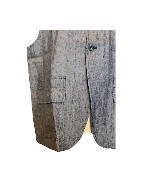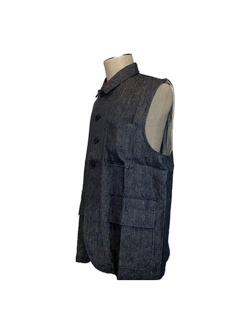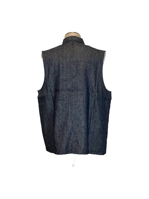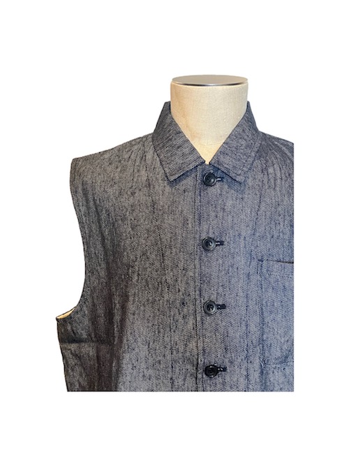 rdv o globeからBILLY VE.をリリース。素材には、コットン/リネンデニムを使用しております。スリーブレスジャケットのデザインで、胸にはパッチポケット、腰ポケットにはパッチ&フラップとなりますレザーの力ボタンもデザインのアクセントになっておりますのでぜひお試しください。